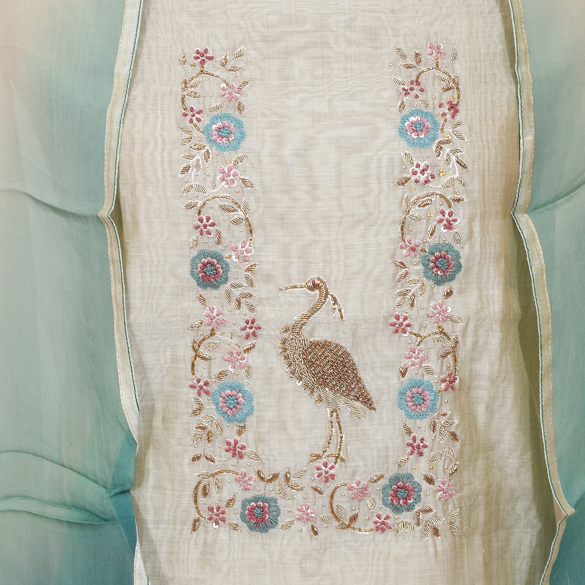 Beige Chanderi Heavy Embroidered Unstitched Suit with Ombre Dupatta