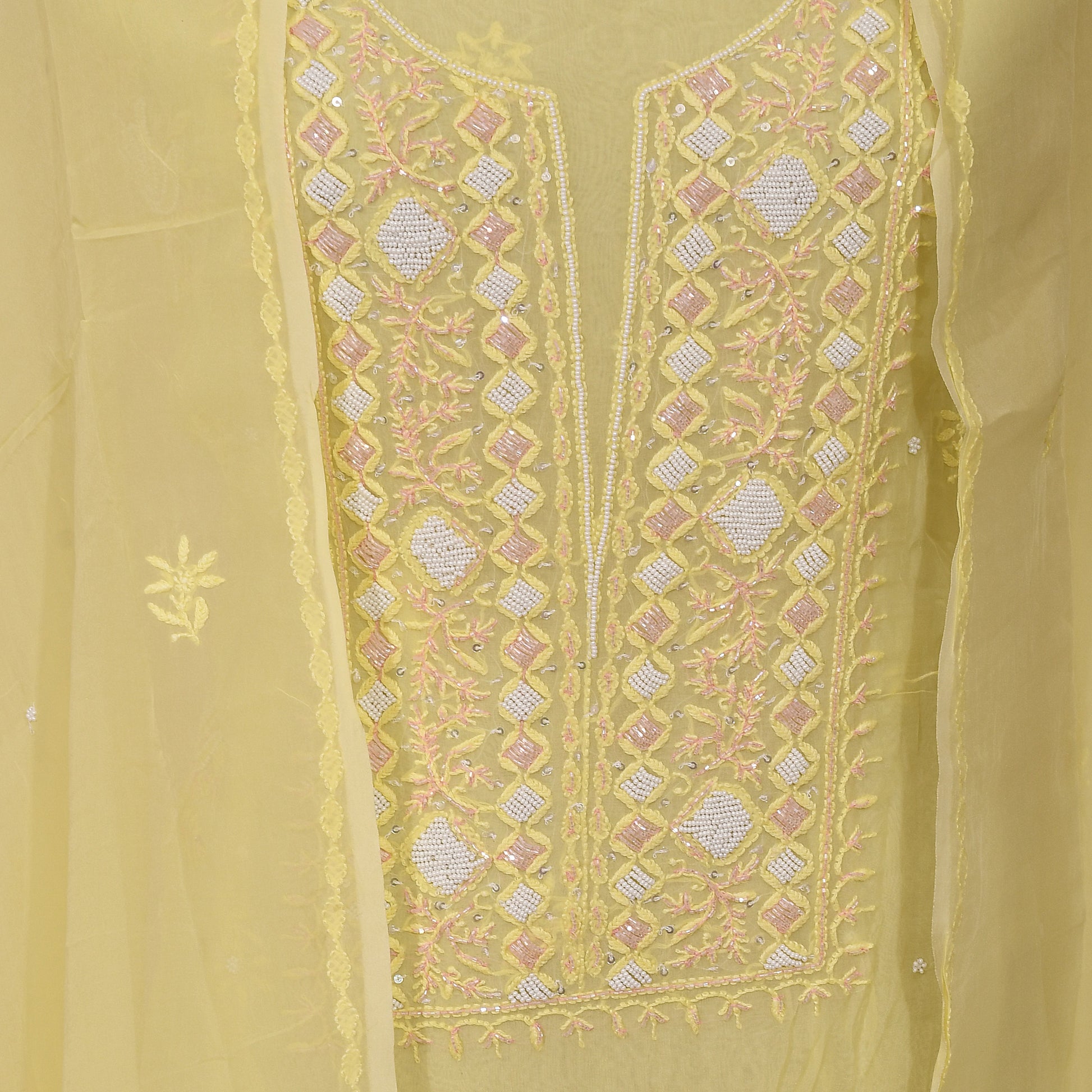 This Yellow Organza Unstitched Suit with Dupatta offers a versatile foundation for custom tailoring. Crafted from delicate organza fabric, it provides a lightweight and elegant base perfect for creating a refined, airy outfit. The included matching dupatta complements the suit, enhancing the overall look with a subtle sheen. Ideal for those seeking personalized style and sophisticated comfort, this unstitched set allows you to tailor the fit and design to your unique preferences.